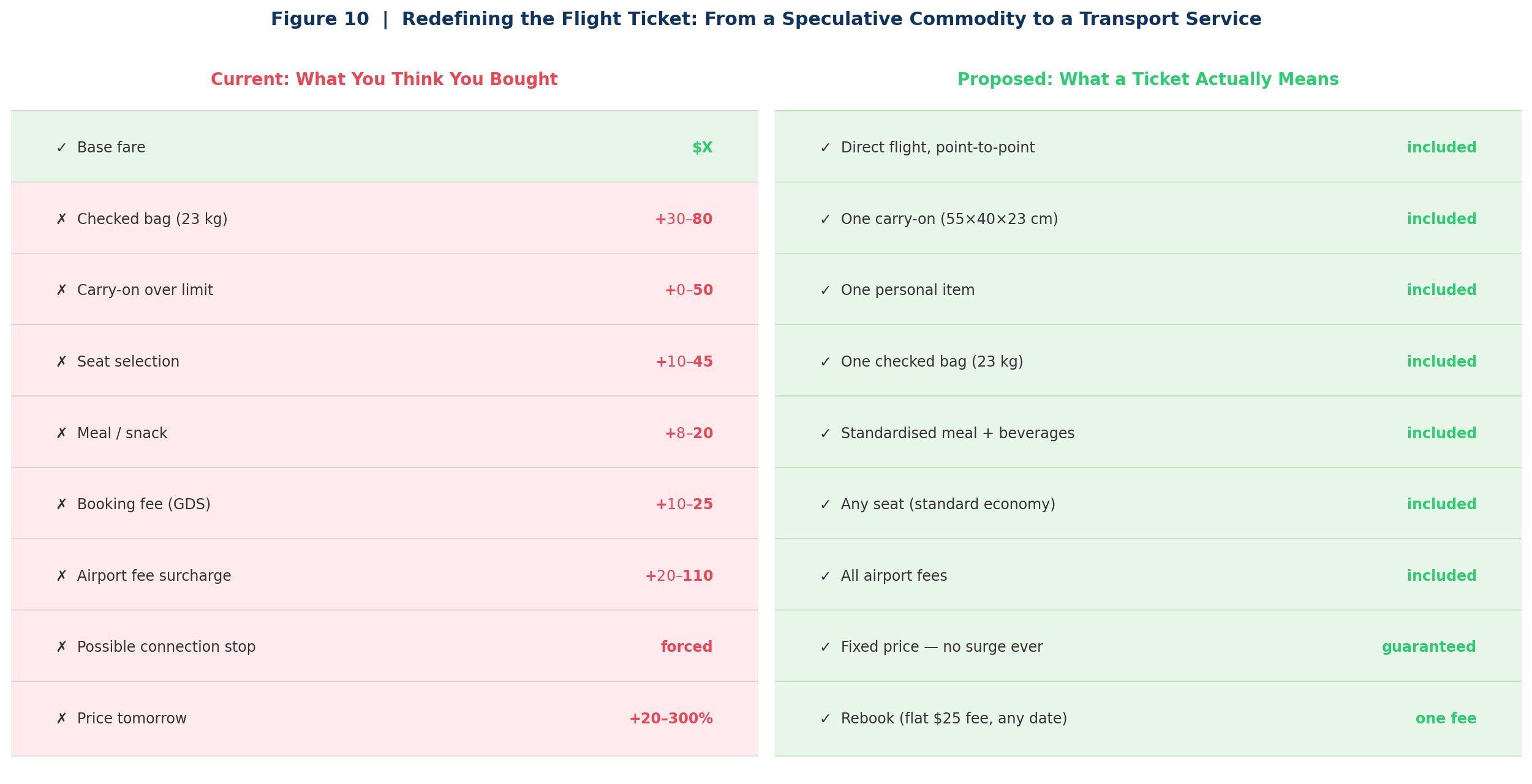 Under the framework proposed in this paper, a flight ticket means one thing: the right to travel from origin to destination, directly, with one carry-on bag (55 Γ 40 Γ 23 cm), one personal item (40 Γ 30 Γ 20 cm), one checked bag of up to 23 kilograms, a standardised meal and beverage service, any standard economy seat, and all applicable airport fees. There are no ancillary charges. The price displayed is the price paid.