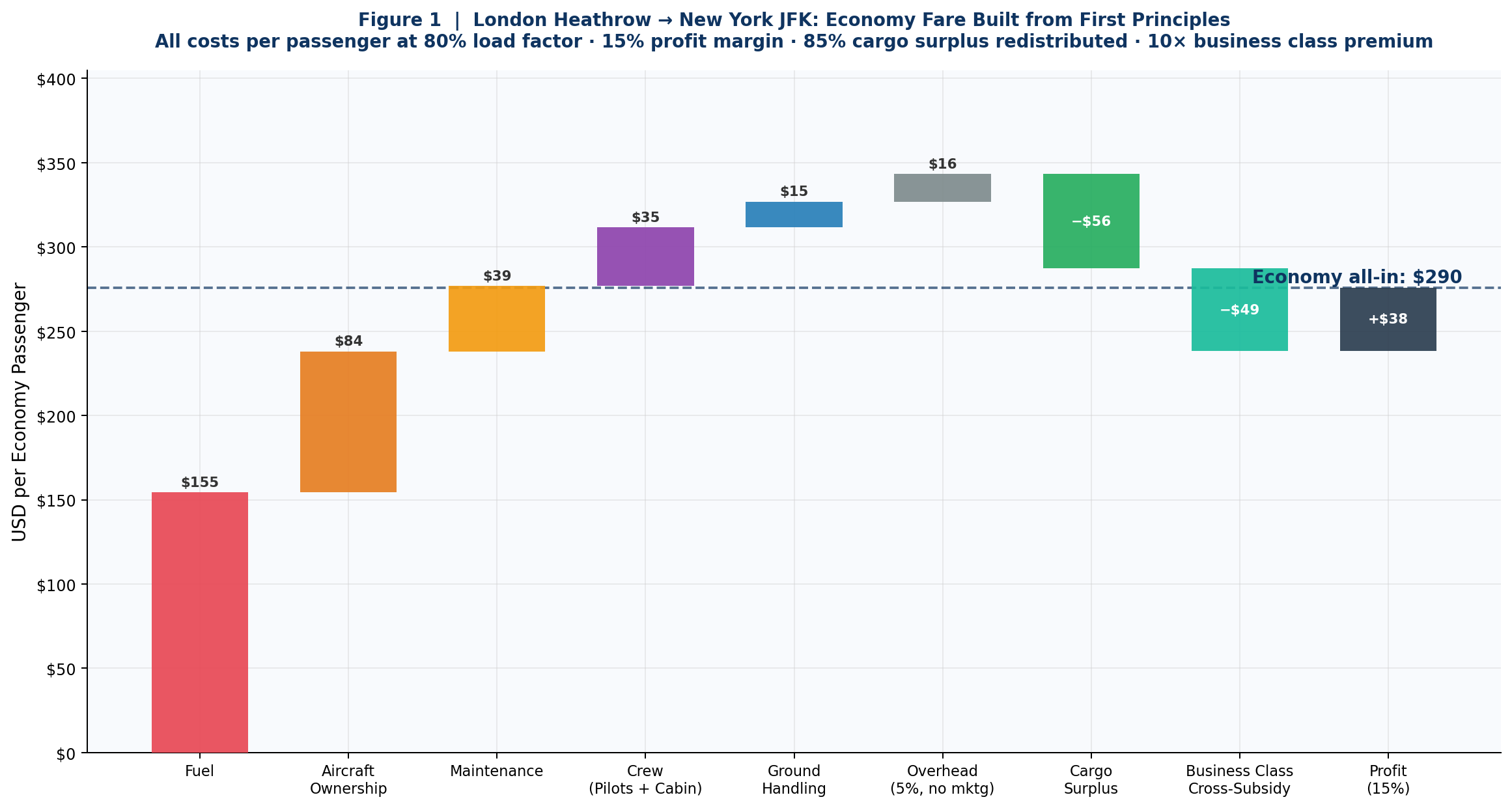 We build a bottom-up cost model from first principles across 206 routes in all G20 countries, deriving economy and business class fares from actual fuel burn, aircraft ownership, crew salary, maintenance, ground handling, and a streamlined overhead structure that eliminates revenue management, GDS distribution costs, and marketing. Business class is allocated 10 percent of cabin floor area and priced at 10 times the economy fare, generating a cross-subsidy that reduces the economy fare. Eighty-five percent of belly cargo surplus revenue is redistributed to passengers.