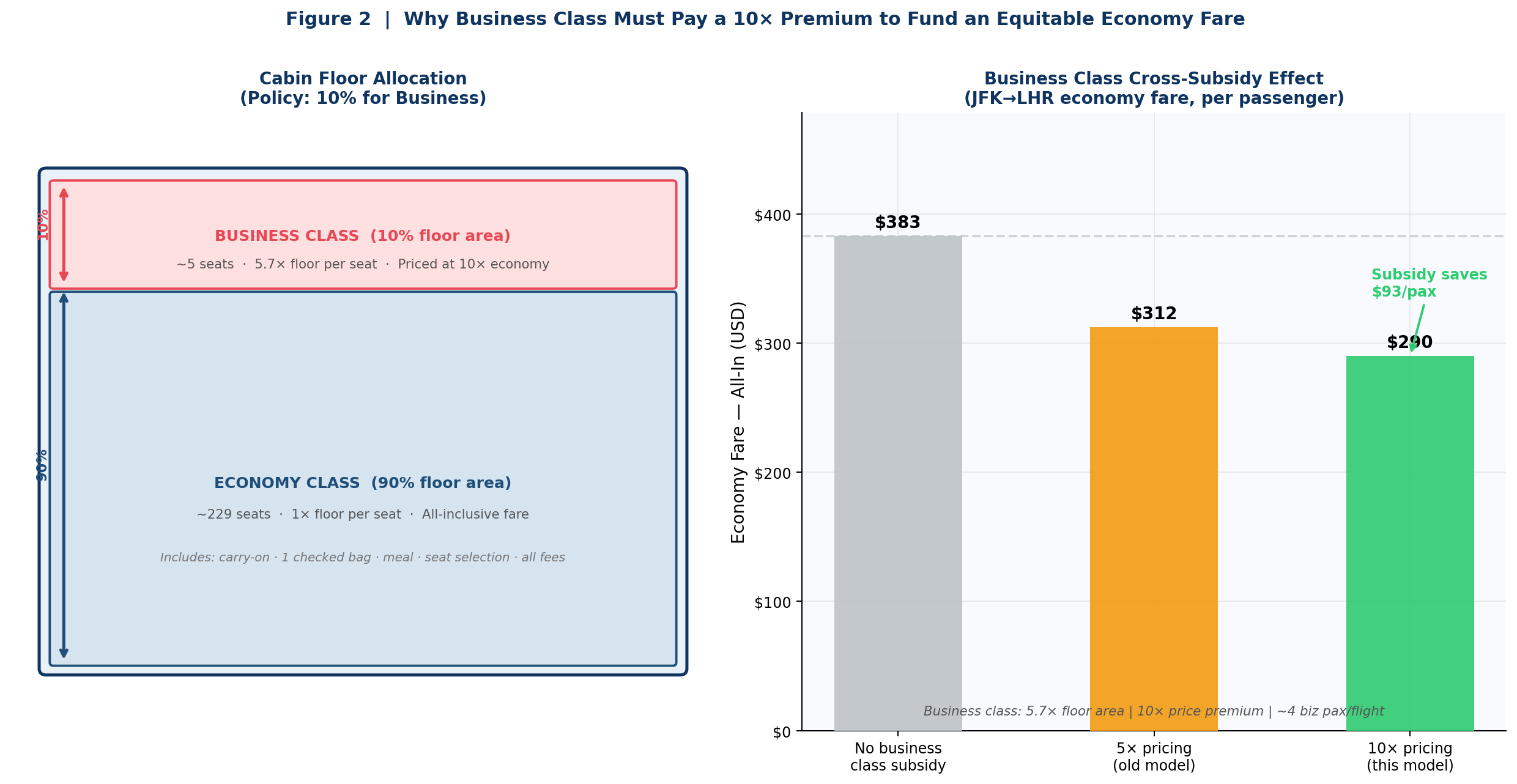 Business class allocation is strictly limited to 10 percent of total cabin floor area. A lie-flat business class seat occupies approximately 5.7 times the floor area of a standard economy seat, confirmed by IATA cabin density studies and Boeing interior specifications. Business class is priced at 10 times the economy fare. On the London to New York route, 4 business passengers paying $2,504 each generates approximately $10,000 per flight, reducing the required economy fare by approximately $47 per passenger.