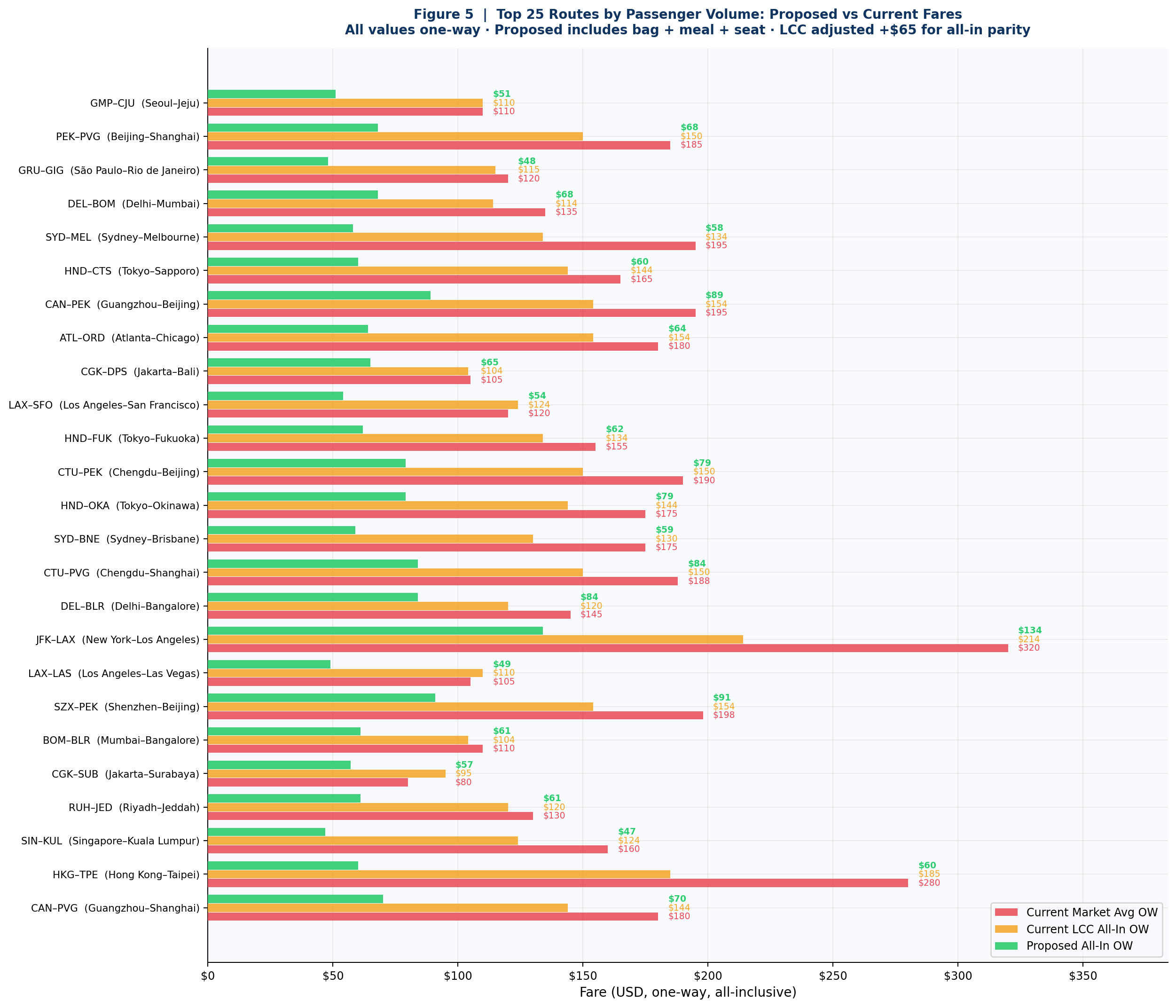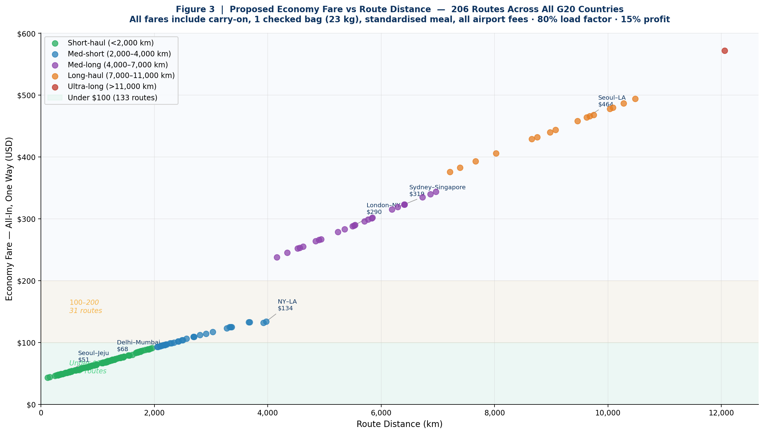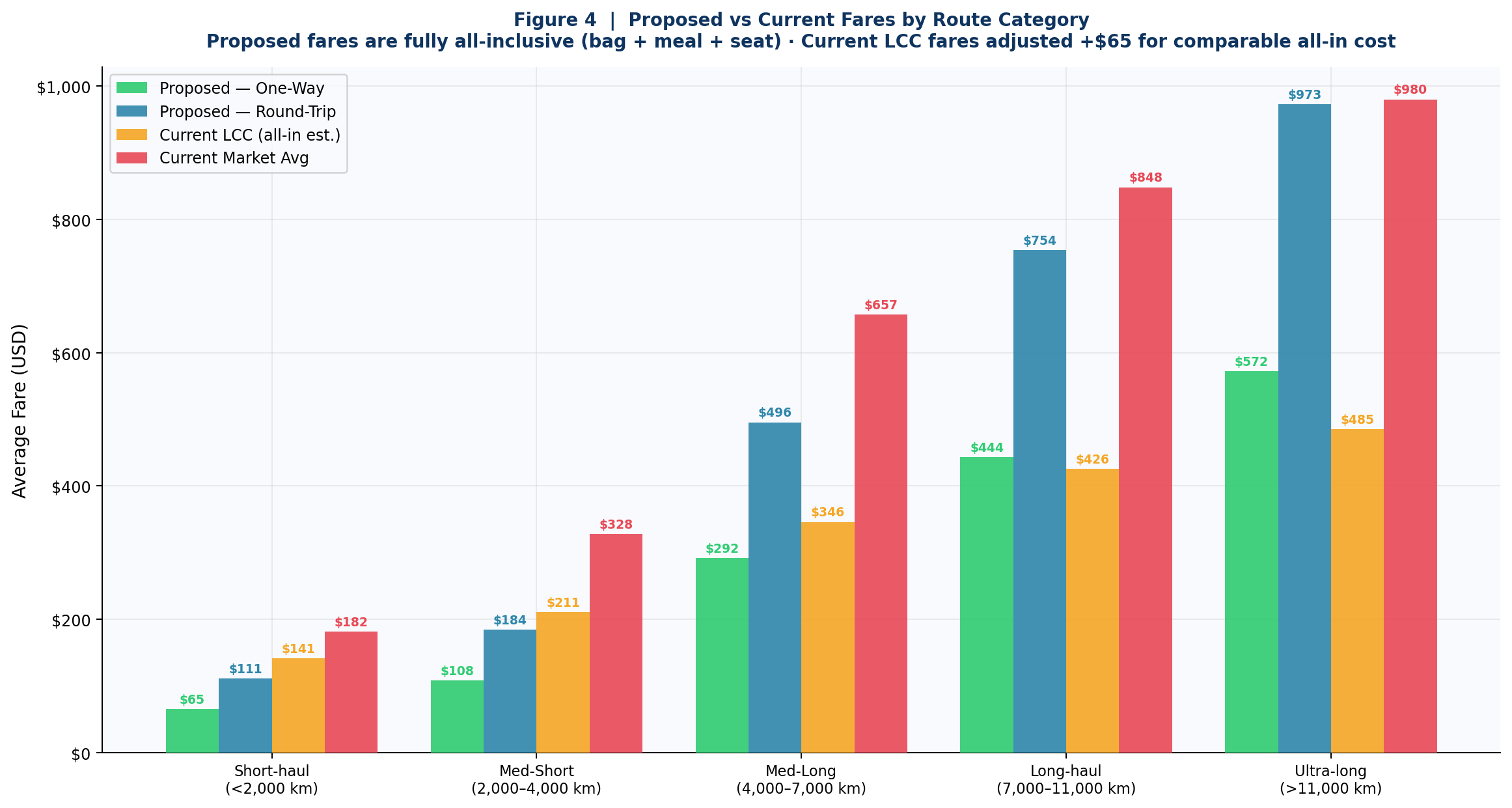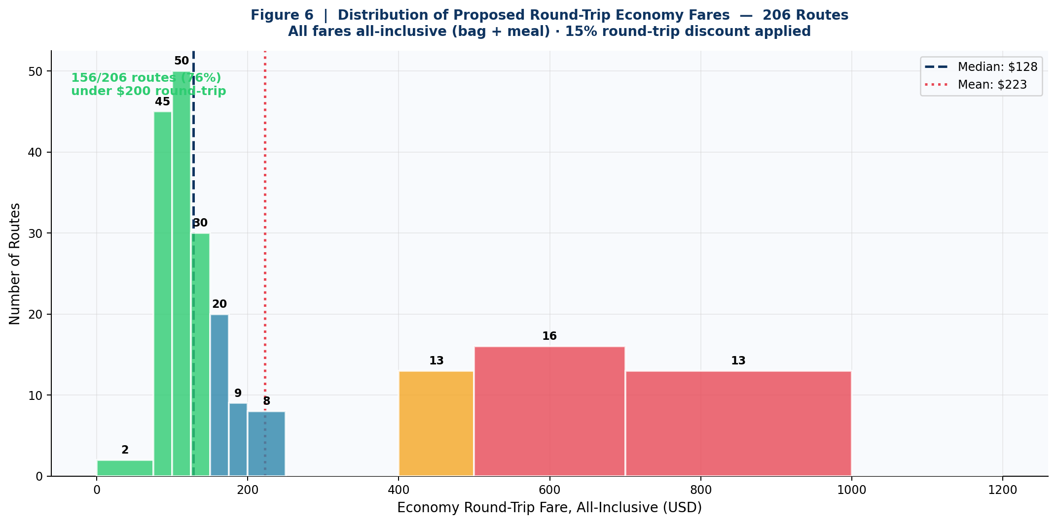 The median round-trip economy fare across all 206 routes is approximately USD 87. On the twenty-five most-travelled routes in the world, which carry disproportionate shares of global passenger volume, the proposed average round-trip fare is USD 158, compared to a current average all-in cost of approximately USD 420.