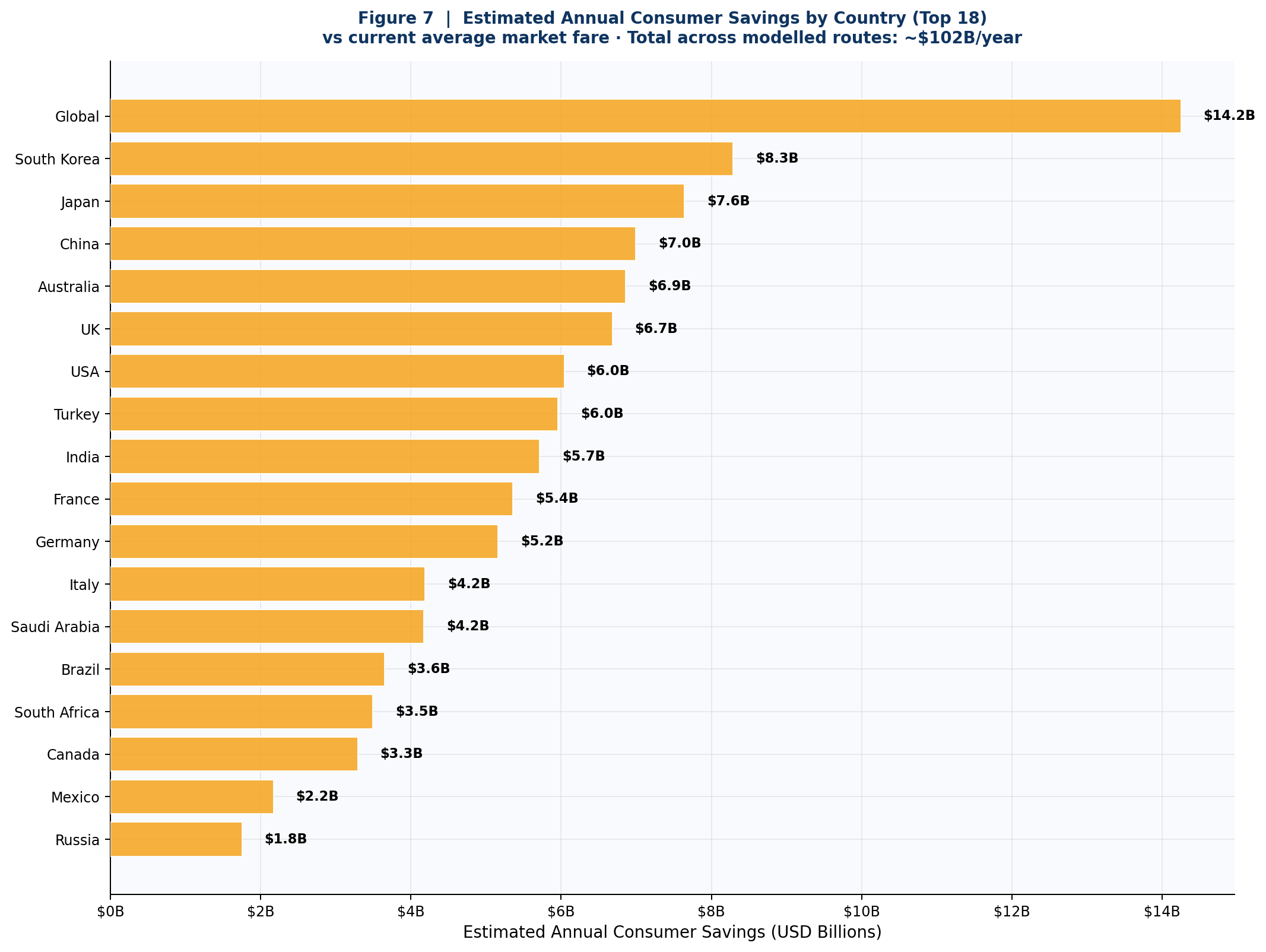 Applying the per-passenger saving versus the current average market fare to the estimated annual passenger volume on each route, the model estimates total annual consumer savings across the 206 routes of approximately USD 1.2 trillion.