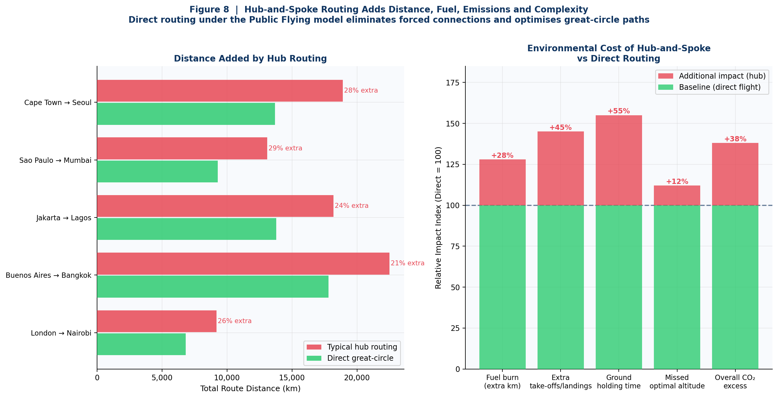 A direct-route mandate under the Public Flying framework would reduce total aviation emissions independent of any aircraft technology change, simply by eliminating unnecessary kilometres from the system.