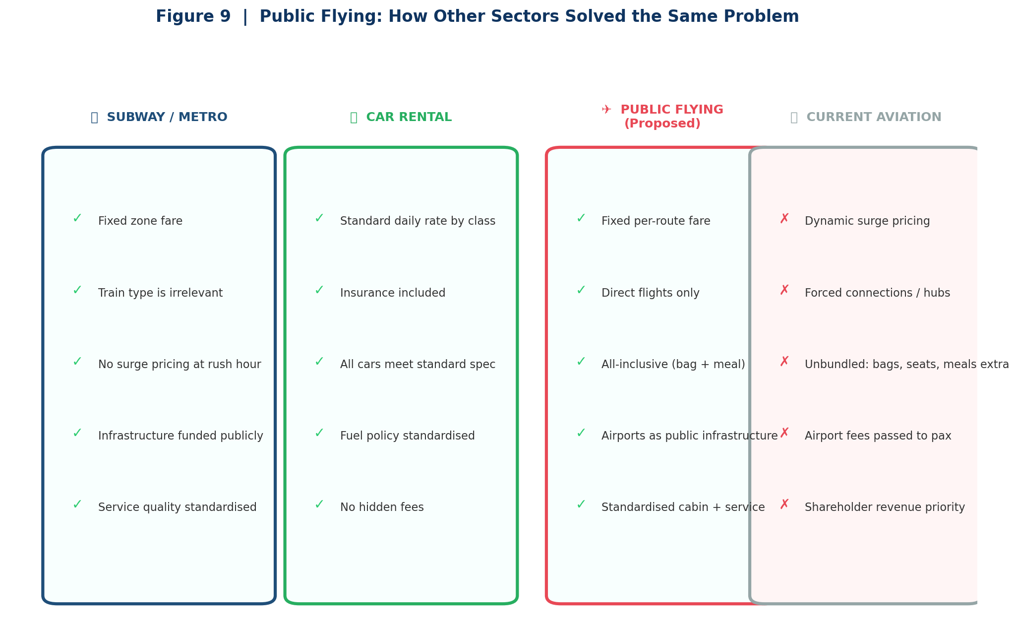 None of these changes require an end to competition, to commercial operation, or to aircraft ownership by private carriers. They require only that the pricing mechanism serve the traveller rather than arbitrage them. The subway does this every day. The rental car industry does this every day. Aviation has the technology, the infrastructure, and the demand to do the same. What it has lacked, until now, is a framework for the arithmetic.
